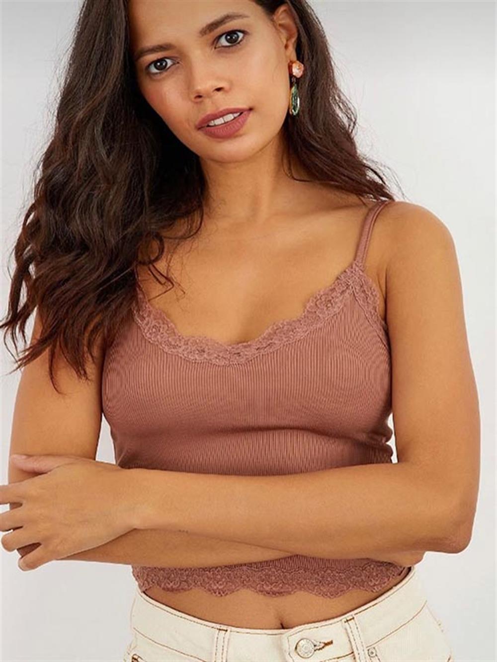 İp Askılı Dantel Detaylı Camel Crop