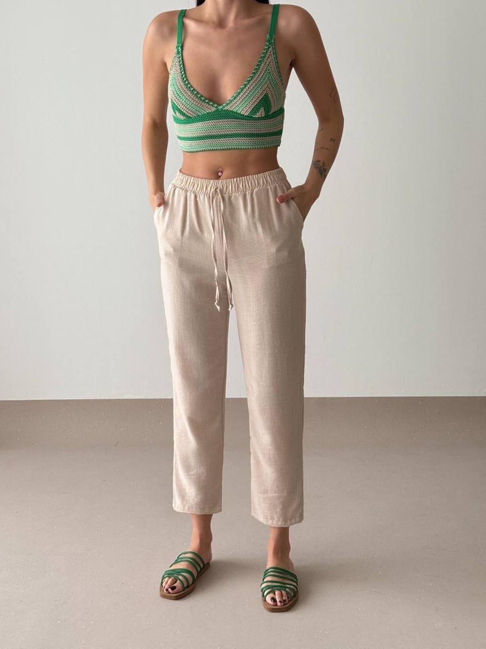 Haki Beli Lastikli Keten Pantolon Lacivert Beli Lastikli Keten Pantolon Acı Kahve Beli Lastikli Keten Pantolon